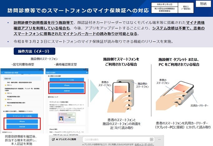 これにより、カードリーダーの設置が困難な環境においても、スマートフォンを用いた資格確認が可能となります。