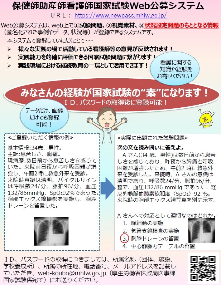 厚生労働省医政局看護課より「保健師助産師看護師国家試験問題の公募について」通達がありましたので、国家試験問題の募集を行っている旨、お知らせします。