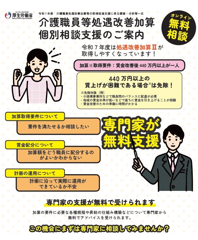 厚生労働省では、処遇改善加算の新規取得及び上位区分への移行について支援が必要な事業所に対し、専門家(社会保険労務士等)による個別相談等を通じて、加算取得促進支援を行う「介護職員等処遇改善加算等の取得促進支援事業」(以下「本事業」という。)をPwCコンサルティング合同会社へ業務委託し、実施しています。